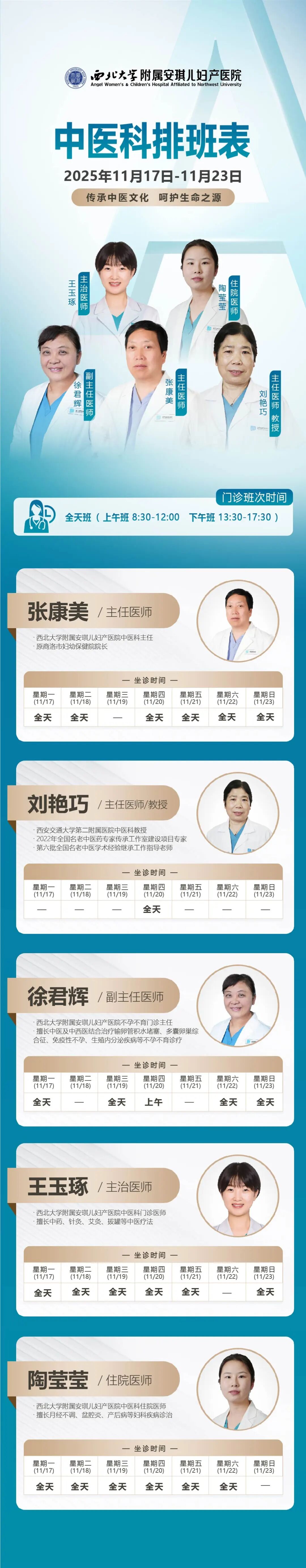 西安安琪儿妇产医院(11月17日至11月23日)专家坐诊时间表