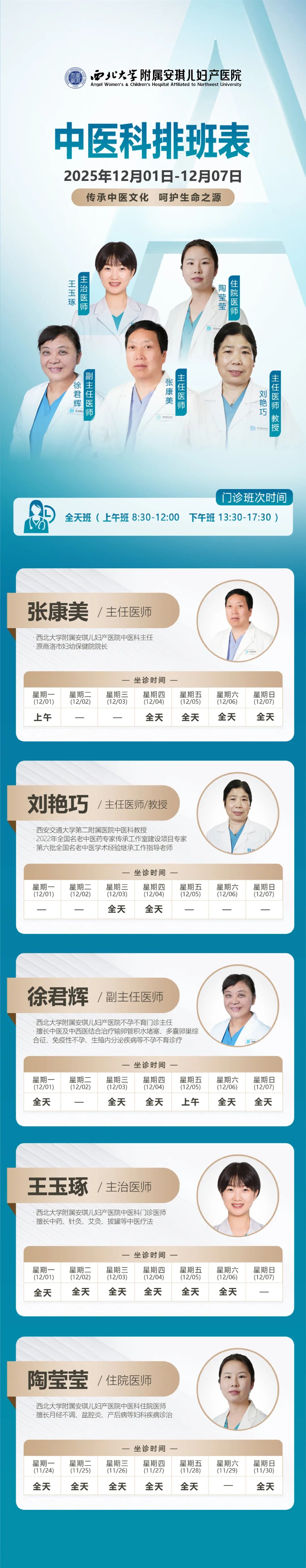 西安安琪儿妇产医院(12月1日至12月7日)专家坐诊时间表