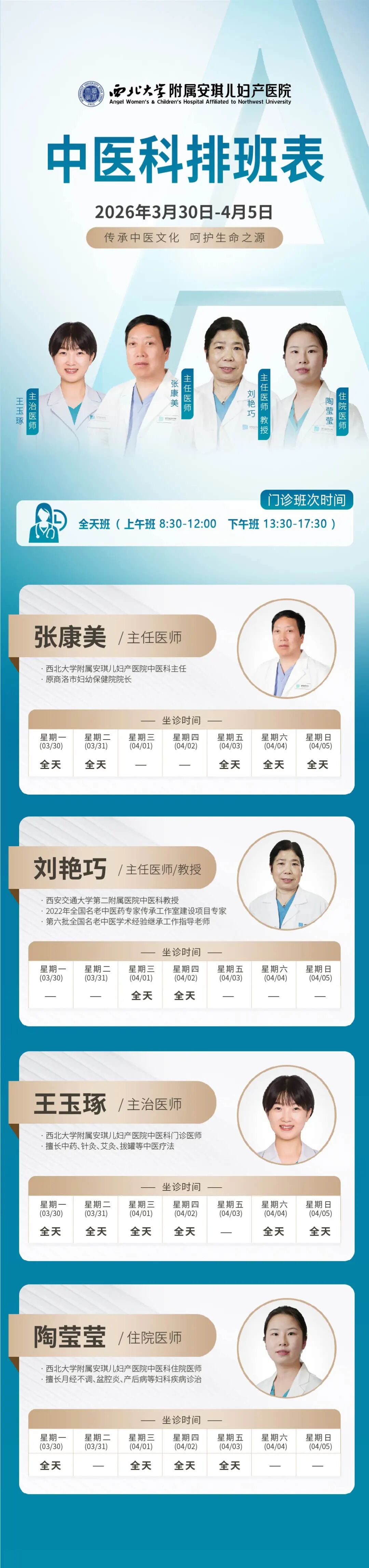 西安安琪儿妇产医院(3月30日至4月5日)专家坐诊时间表