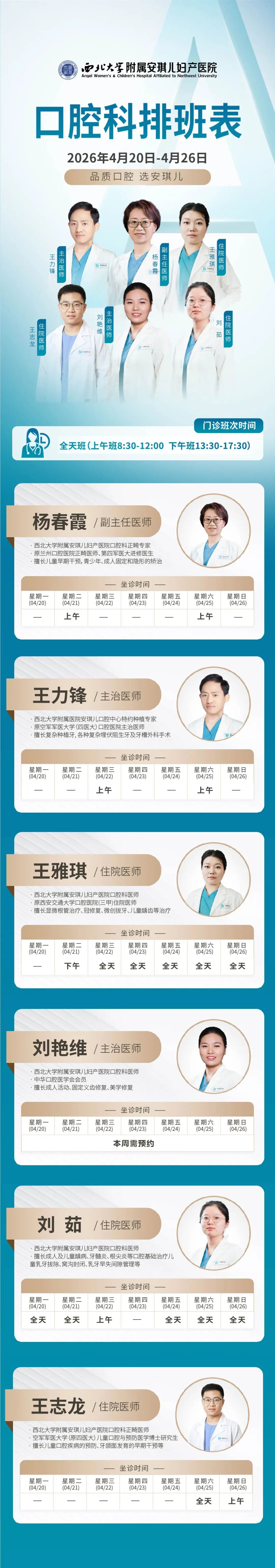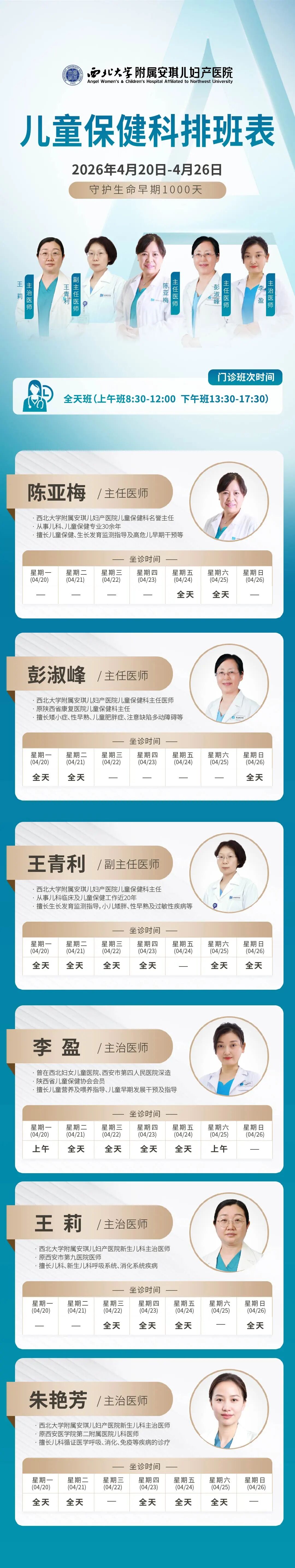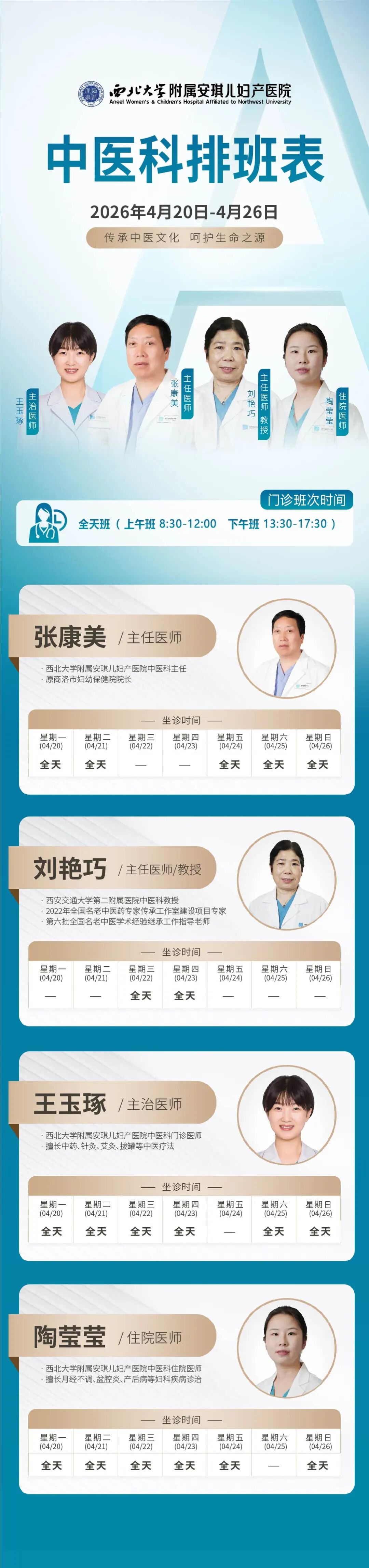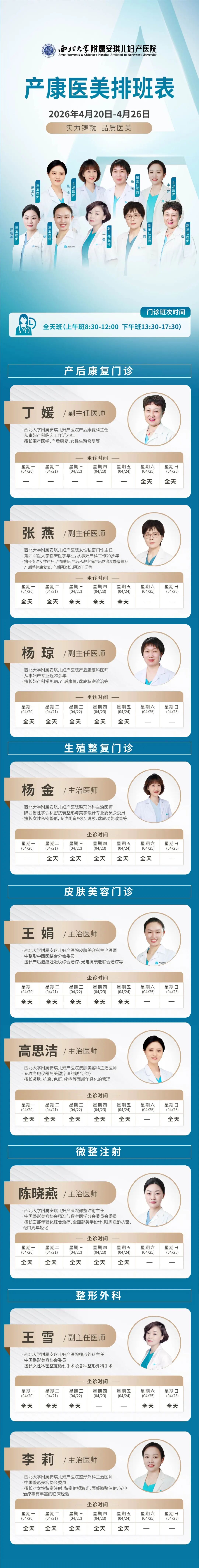 西安安琪儿妇产医院(4月20日至4月26日)专家坐诊时间表
